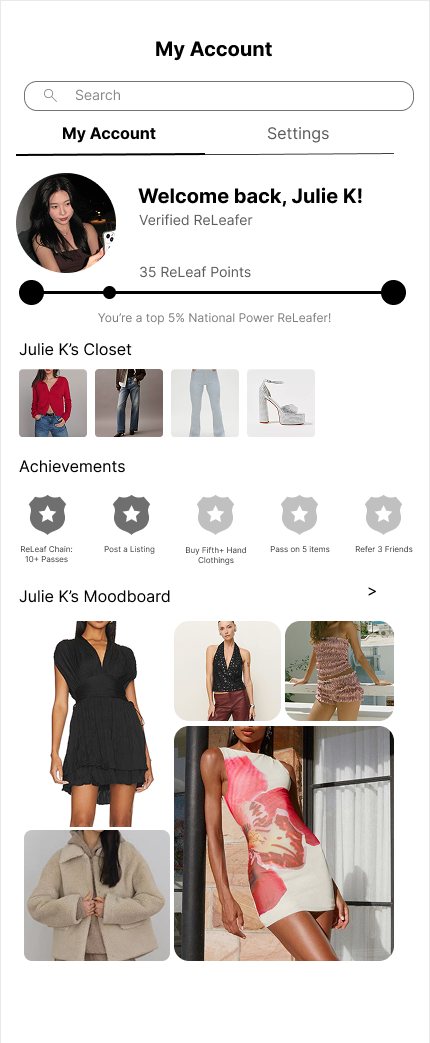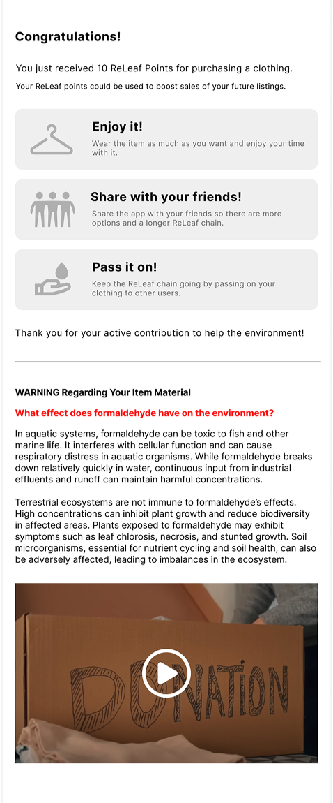 Implement ReLeaf Point System to reward active app users. Display item ownership history to build community connections and trust, while acknowledging each contributor to the circular shopping journey.