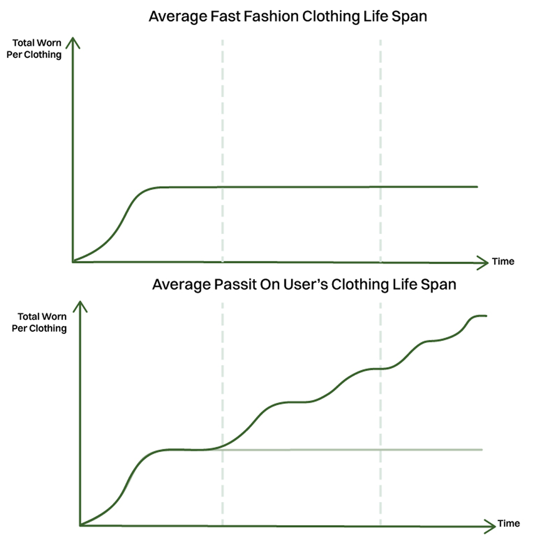 Encourage users to pass on clothes so that multiple users (e.g. 5+ users) can all be given the opportunity to wear the same item at least three times, reducing waste while enjoying trendy designs at affordable prices.